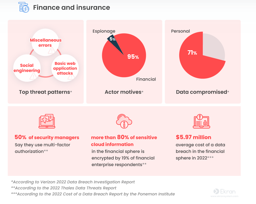 大多数数据泄露尝试都包括 Web 应用程序攻击。由于数以百万计的客户使用这些应用程序,因此检测和消除这些攻击尤其困难。现实世界中的金融企业也面临数据泄露威胁:骗子在 ATM 上安装窃取器和卡陷阱,或者干脆窃取机器。Verizon 2022 数据泄露调查报告还发现,金融和保险领域 27% 的数据泄露可以追溯到内部活动。